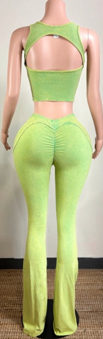 Mineral wash, open back cropped tank & pocket flare leg pant set.