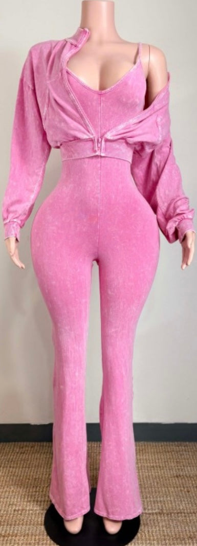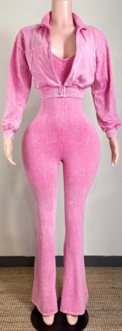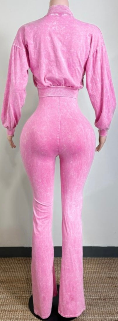 Mineral wash zip up cropped jacket and deep-v flare jumpsuit set.