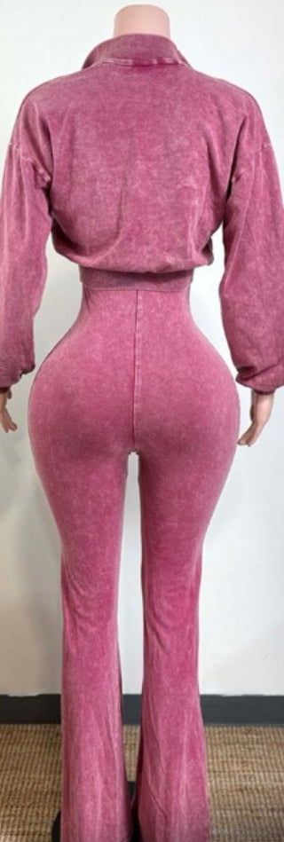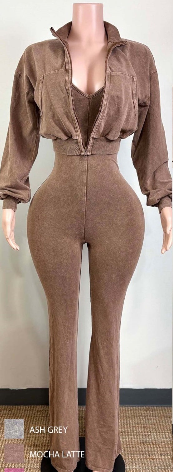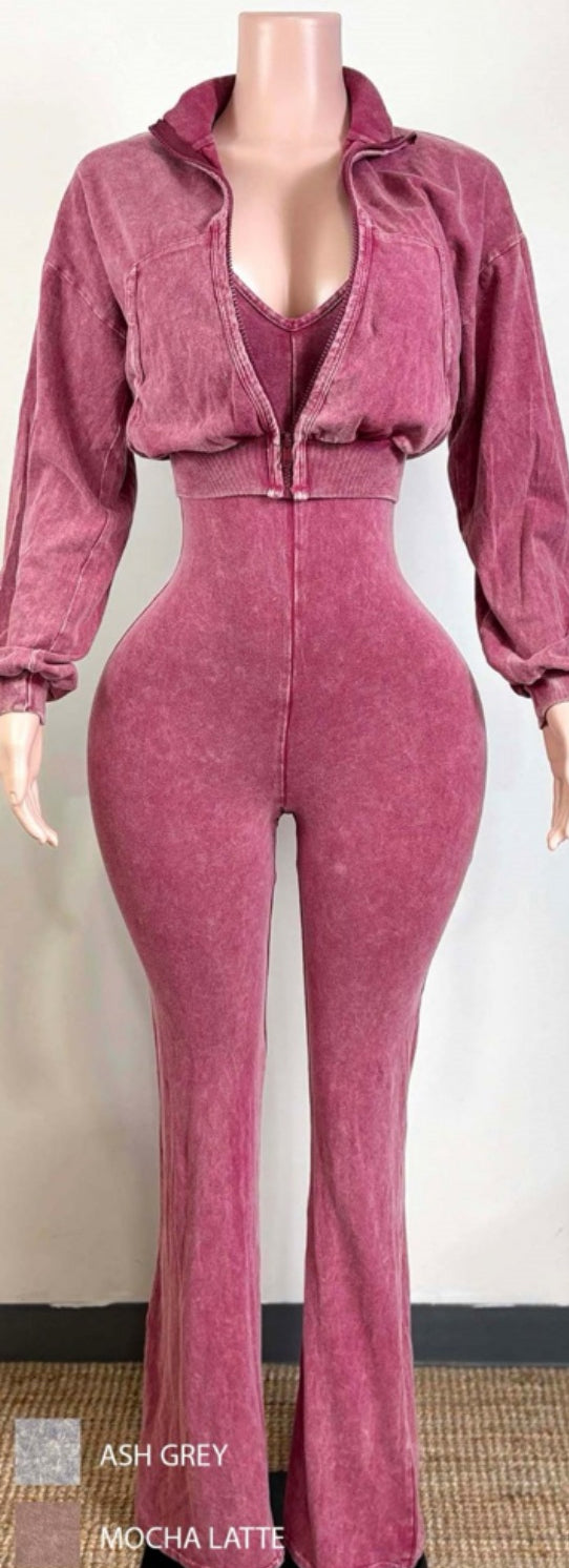 Mineral wash zip up cropped jacket and deep-v flare jumpsuit set.