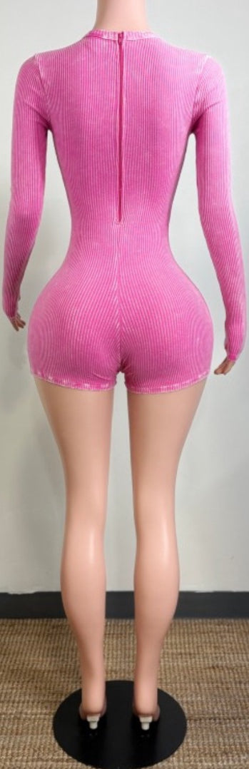 Long sleeve mineral wash denim trim safety pin detail romper.
