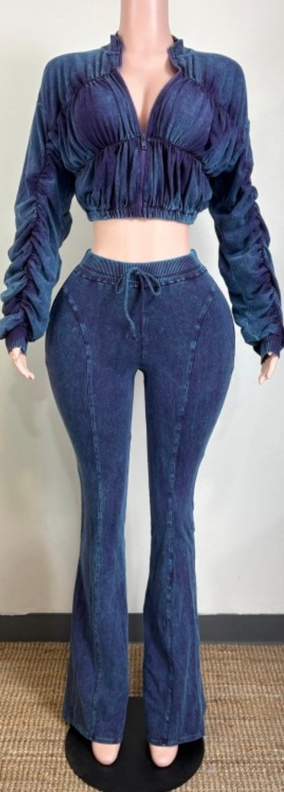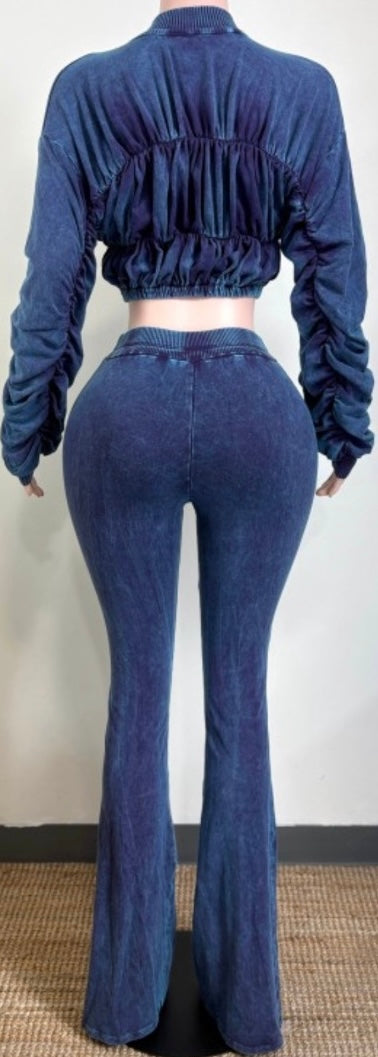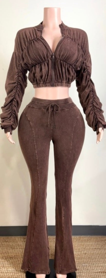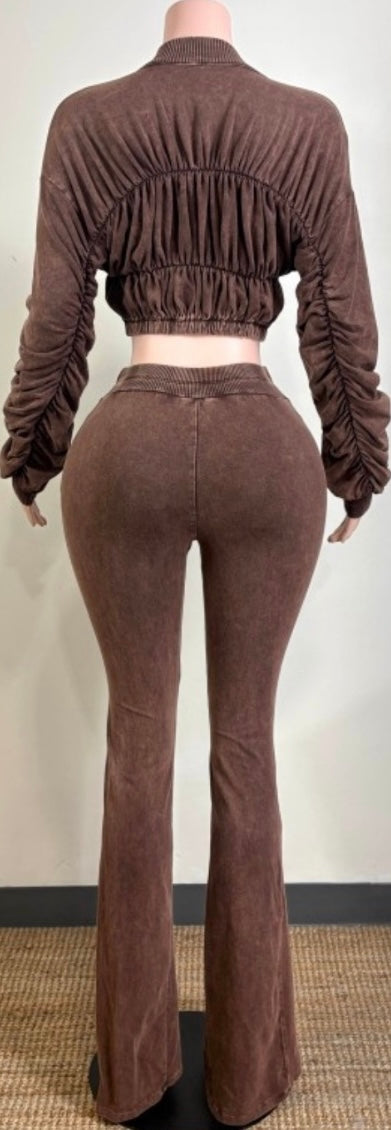 Long sleeve zip up ruched sleeve, flare leg pant set.