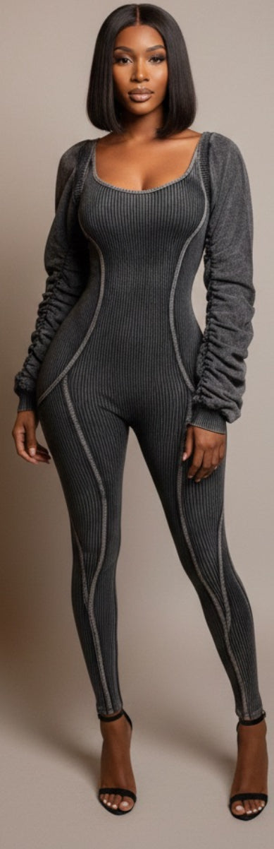 Long sleeve mineral wash ruched sleeve crop jacket, contour jumpsuit set.