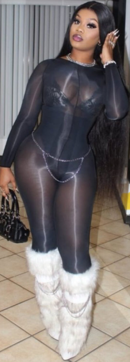 Long sleeve sheer body stocking jumpsuit.