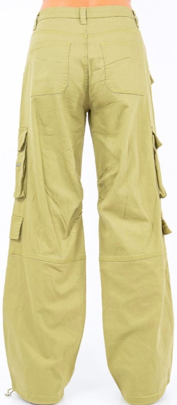 Wide leg, loose fitting multi pocket pants w/ button waist closure.